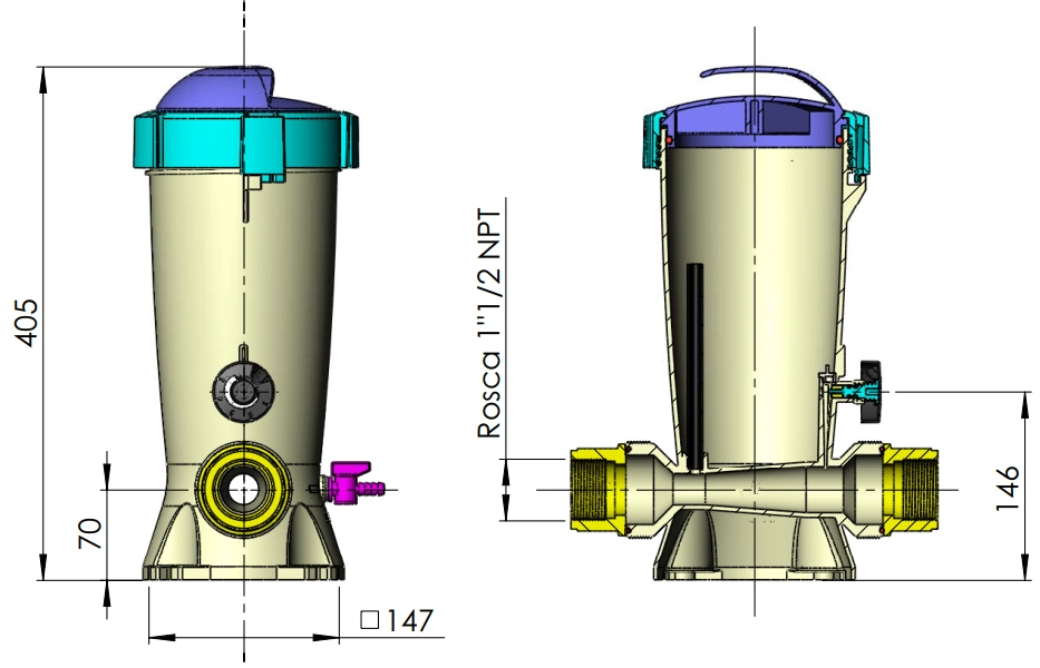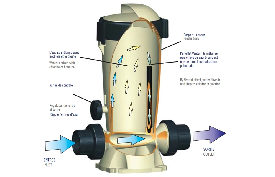 Klór és bróm tabletták tárolására és kioldódással történő adagolására használható. A kioldódás szabályozható az oldalán található vegyszermennyiség szabályzó szeleppel (teljesen el is zárható).