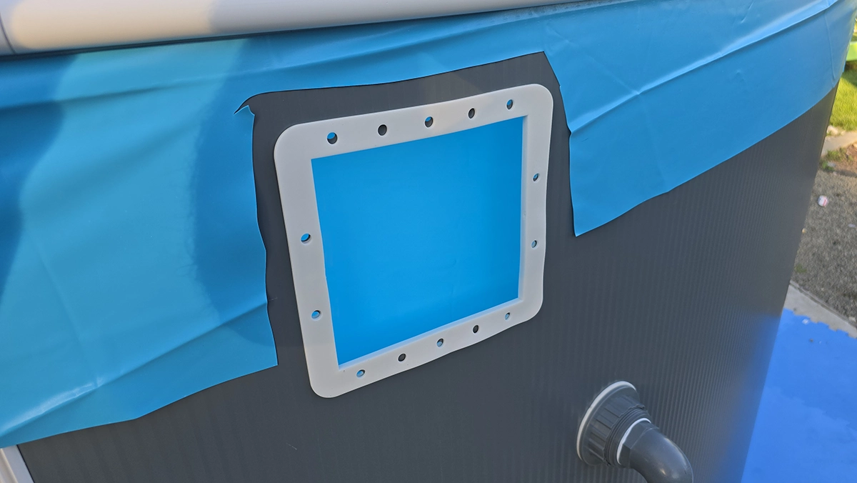 6. A befúvó és a szkimmer szintje előtt zárja el a vizet, majd vágja ki a fólián a megfelelő nyílásokat. Szerelje vissza a befúvót és a szkimmert a medencébe, majd folytassa a vízzel való feltöltést.