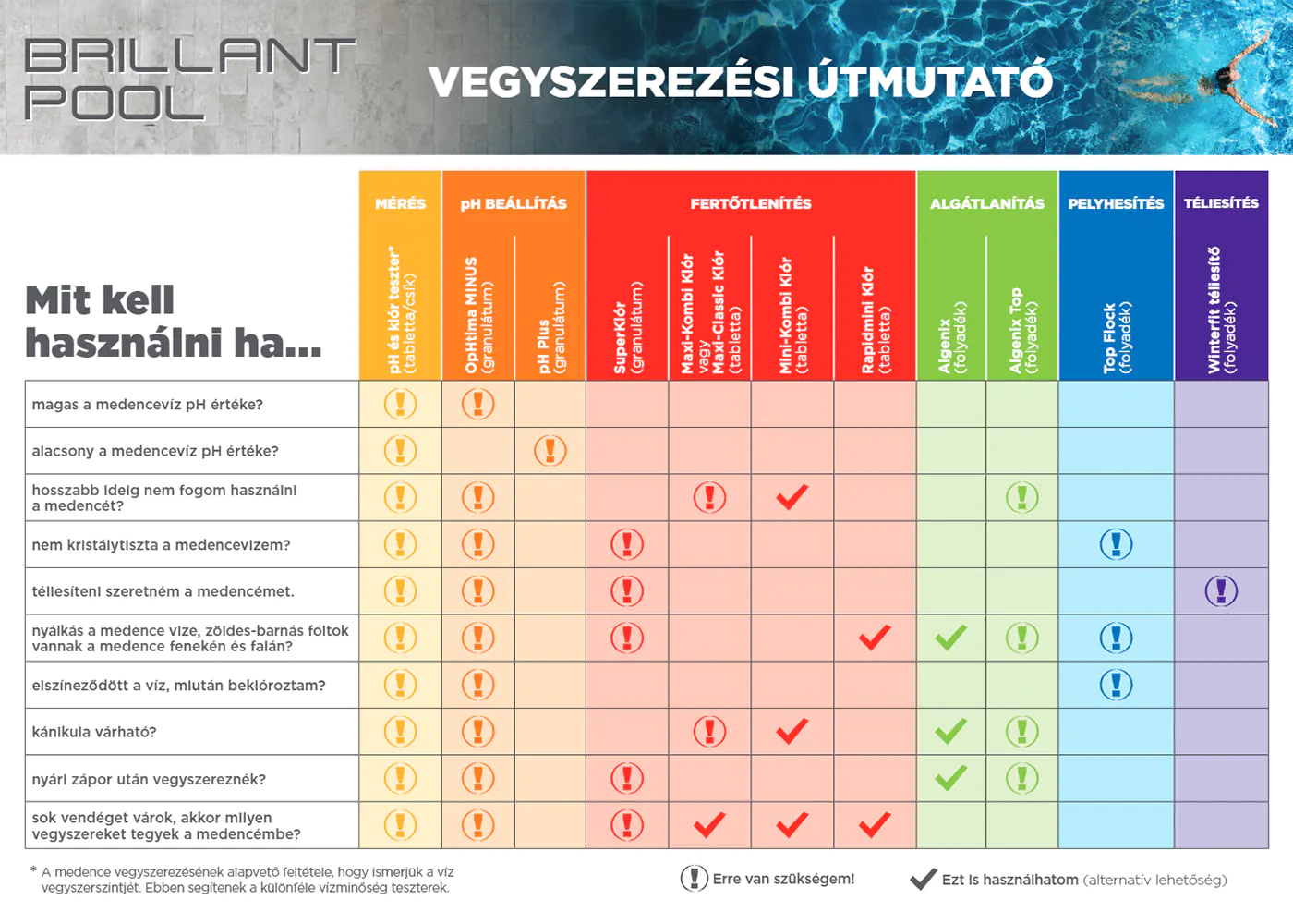 1. Állítsuk be az uszodavíz klórszintjét gyorsan oldódó termékeinkkel (Superklór vagy Rapidmini klór) 0,4 – 0,8 mg/literre.