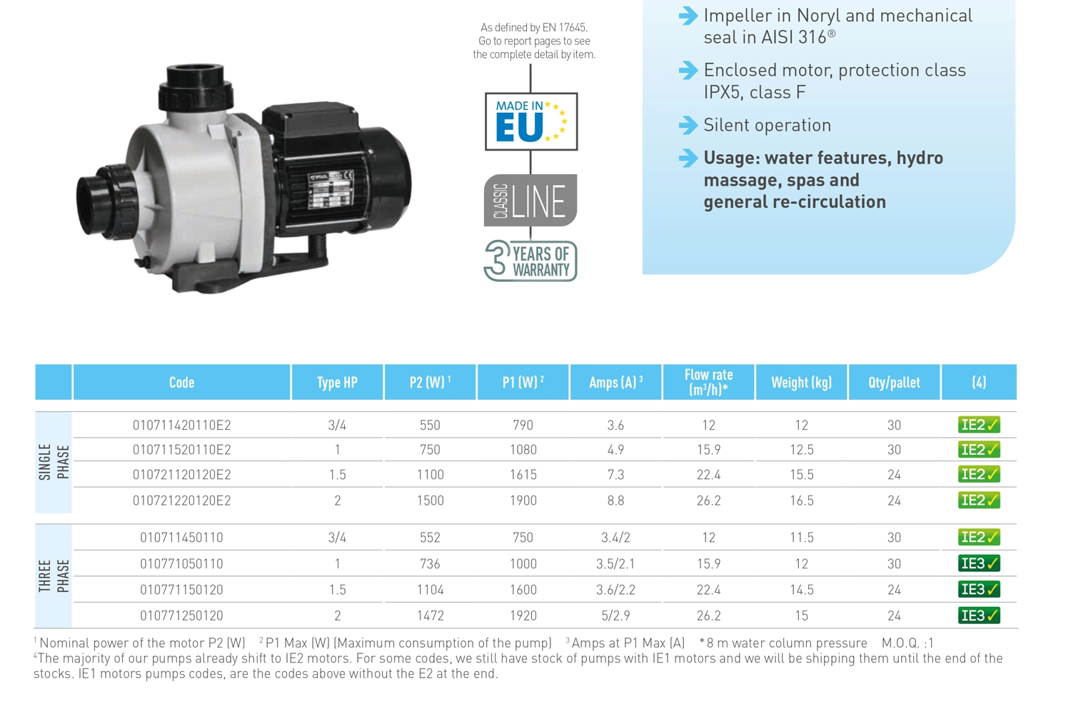 A motor egyfázisú, 2 lóerős és maximális áramlási teljesítménye 26m3/h. Sós vizes medencék esetén is használható (tengervízben is!).