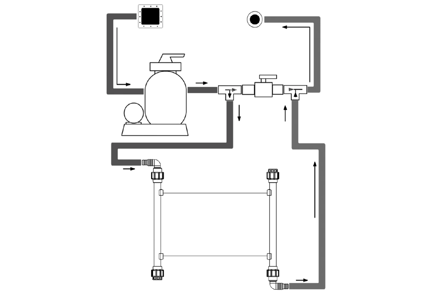 Bypass használatával megkerülő ágat tud készíteni, mellyel csökkenteni tudja a szolár panelen átfolyó víz sebességét és mennyiségét. Így a víz melegítése még nagyobb hatásfokon tud létrejönni, ezenkívül kevésvé fogja vissza a vízforgató teljesítményét! Bekötése a mellékelt ábrán látható. A golyóscsap segítségével az átfolyást tetszés szerint állíthatja. A bypass készlet itt található a honlapunkon: ---> Bypass készlet - 1 csapos kivitelben
