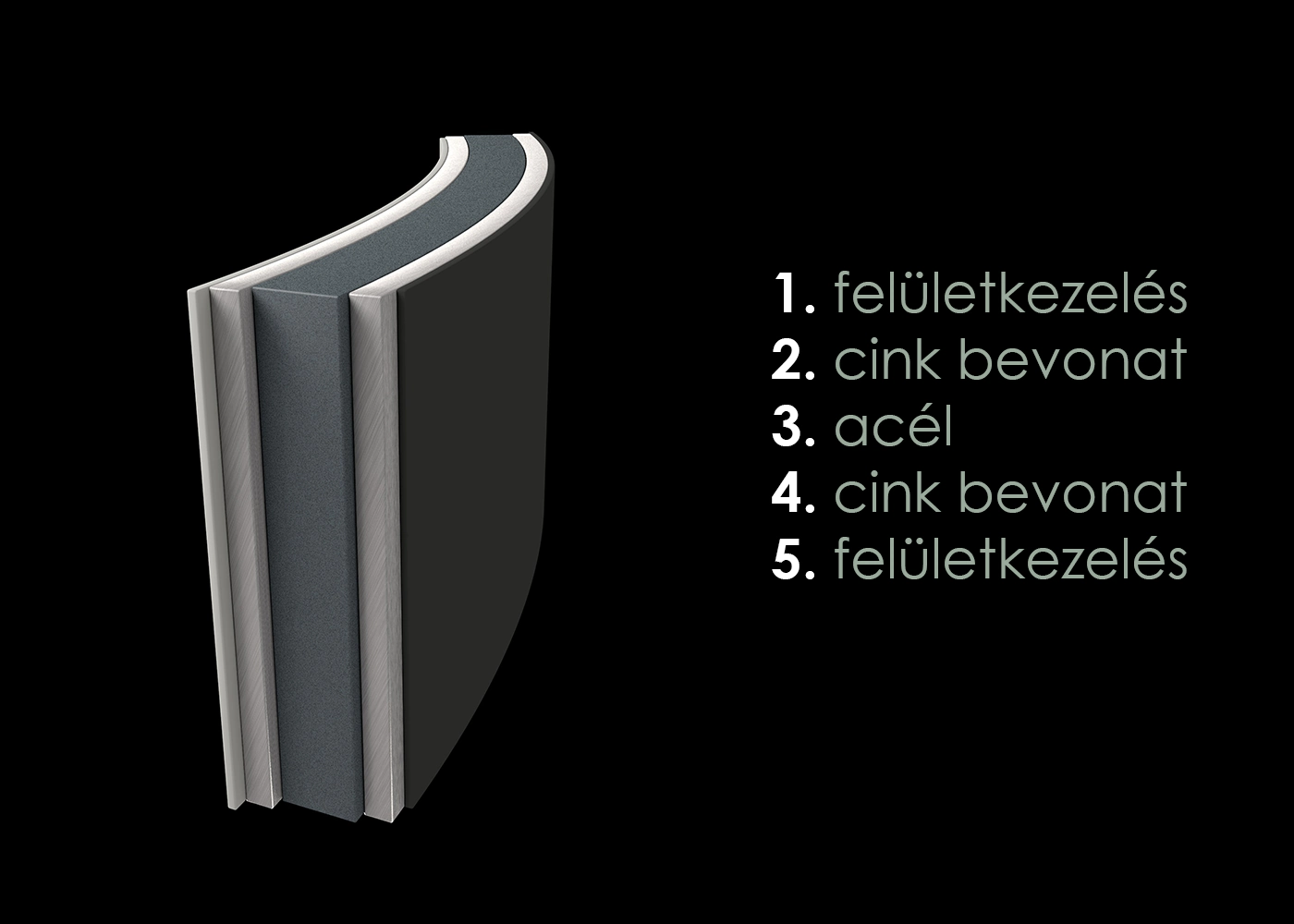 Az oldalfal tüzihorganyzott 0.4 mm-es lemezből készül többrétegű bevonattal, redőzött merevítéssel. (5 réteg)