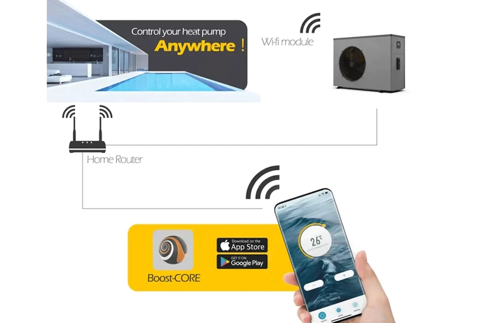 A beépített WiFi modul lehetővé teszi, hogy a hőszivattyút távolról, okostelefonról vagy tabletről vezérelje. A BOOST CORE (Tuya – Smart Life) alkalmazás segítségével: