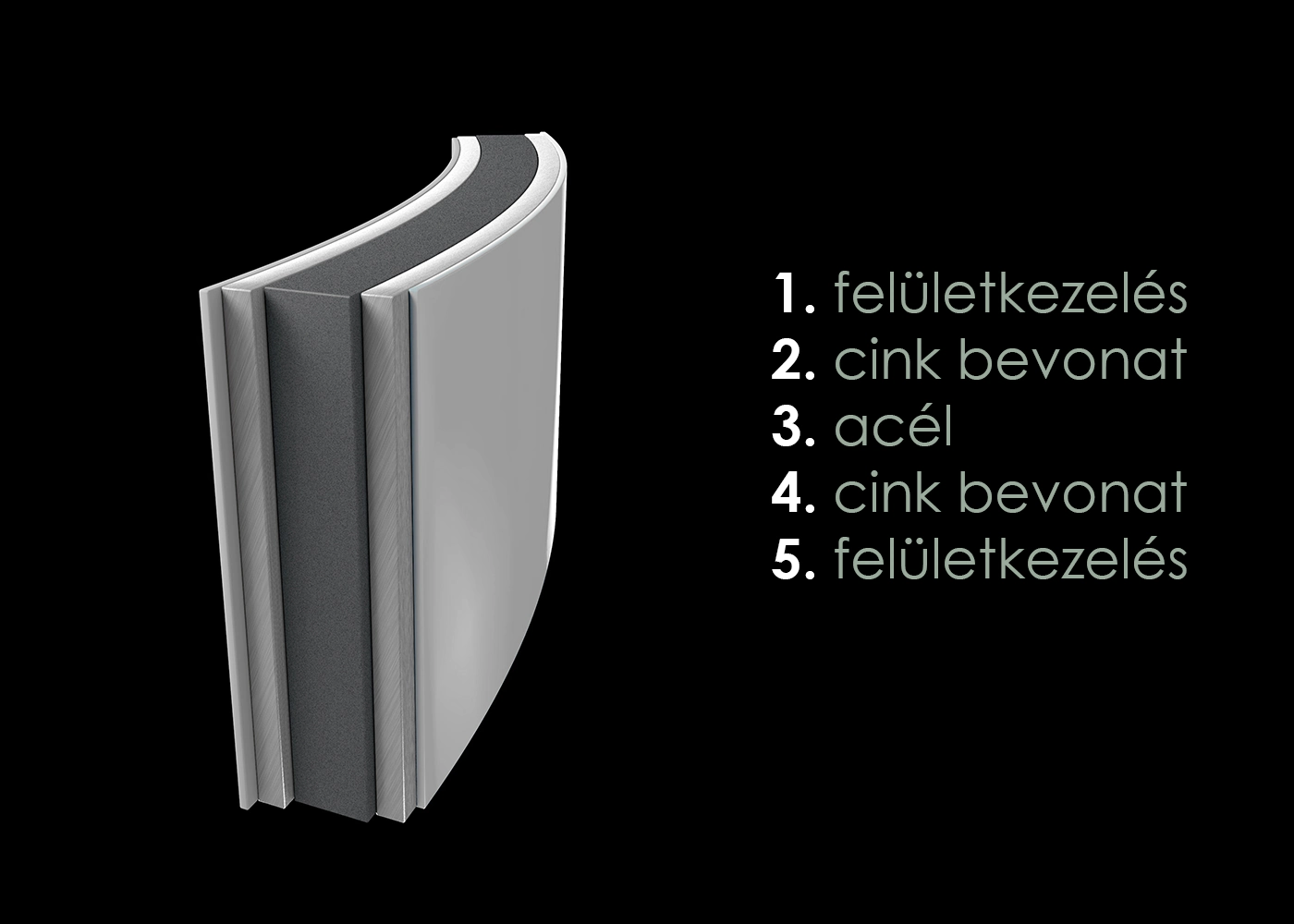 Az oldalfal tüzihorganyzott 0.4 mm-es lemezből készül többrétegű bevonattal, redőzött merevítéssel. (5 réteg)